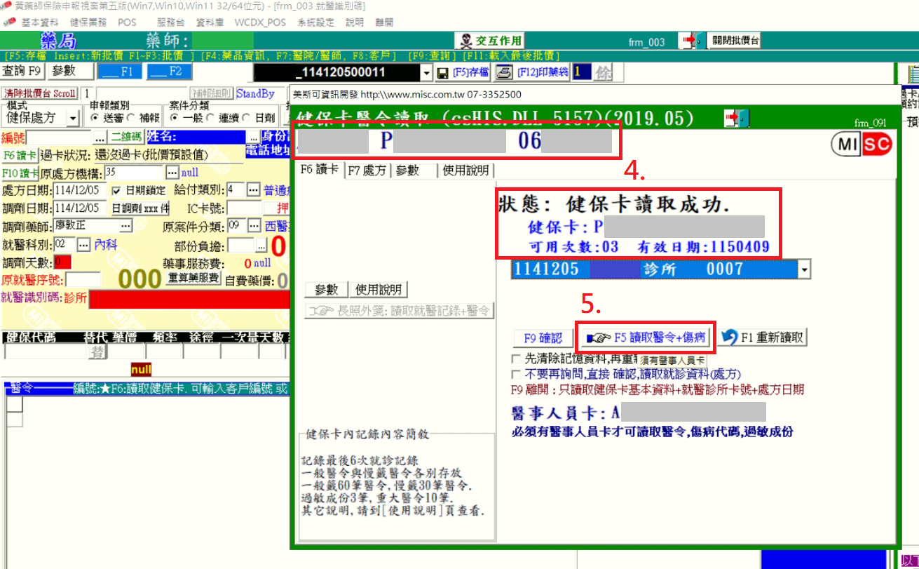 4.健保卡讀取成功時,會顯示患者資料(姓名、身份證字號、出生年月日、可用次數、有效日期等)