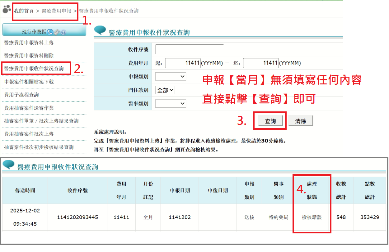 1.點選【 醫療費用申報】>【醫療費用申報收件狀況查詢】