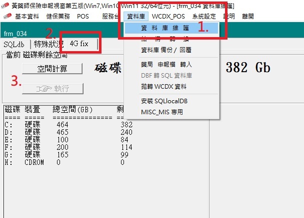 2.點選上方功能:資料庫->資料庫維護->4G fix->先點空間計算再按->執行 (如下圖);