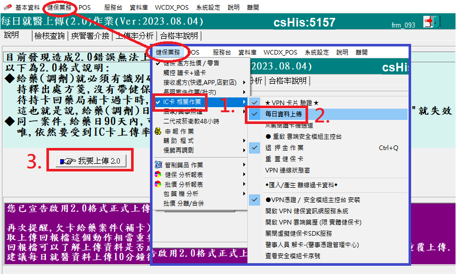 1.健保業務>IC卡相關作業>每日資料上傳>我要上傳2.0