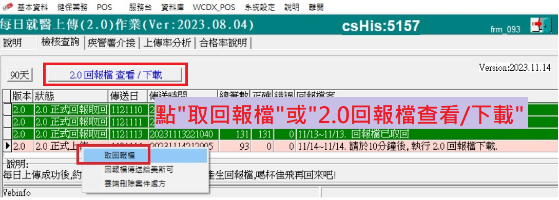 6.完成上傳請記得取回報檔:點擊【2.0回報檔查看/下載】或於該焦點列點滑鼠右鍵>點擊【取回報檔】
