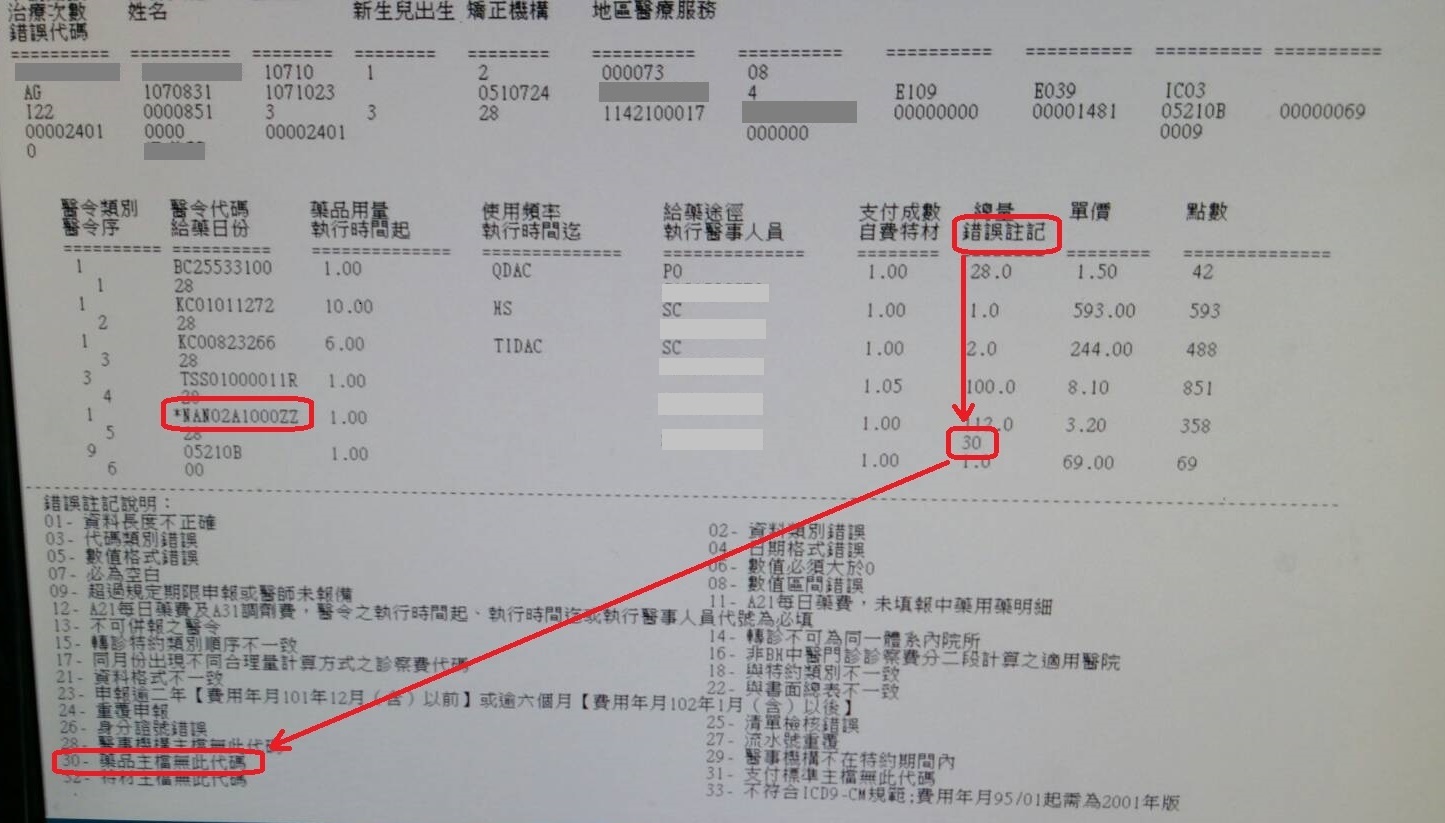 (1)先找到錯誤欄位:下面例子星號(*)出現在醫令代碼(*NAN02A01000ZZ)