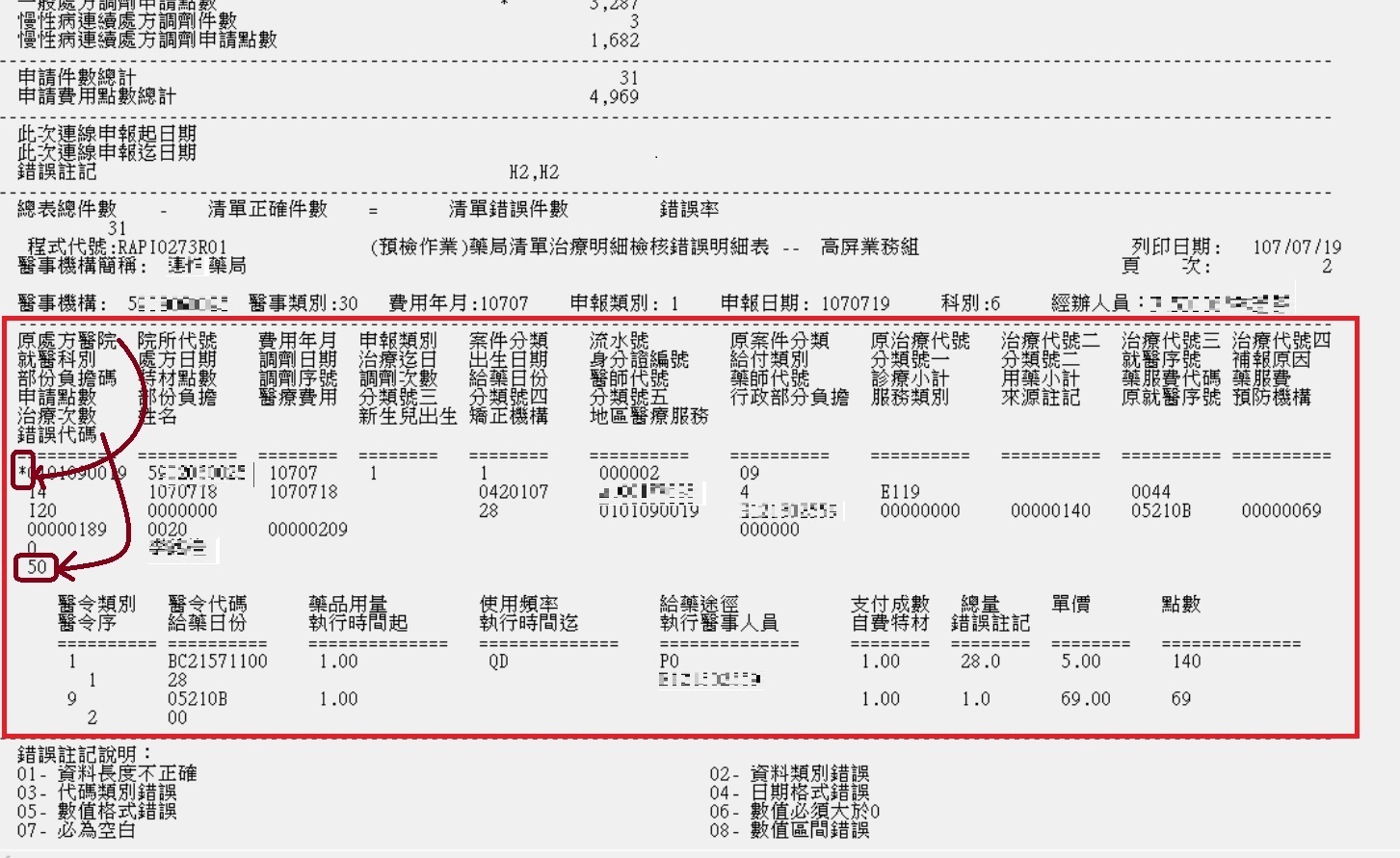 (2)再查看錯誤代碼:每筆左邊中文欄位最下方為錯誤代碼,例如:錯誤代碼為50-就醫或調劑或檢驗日期不在合約期間