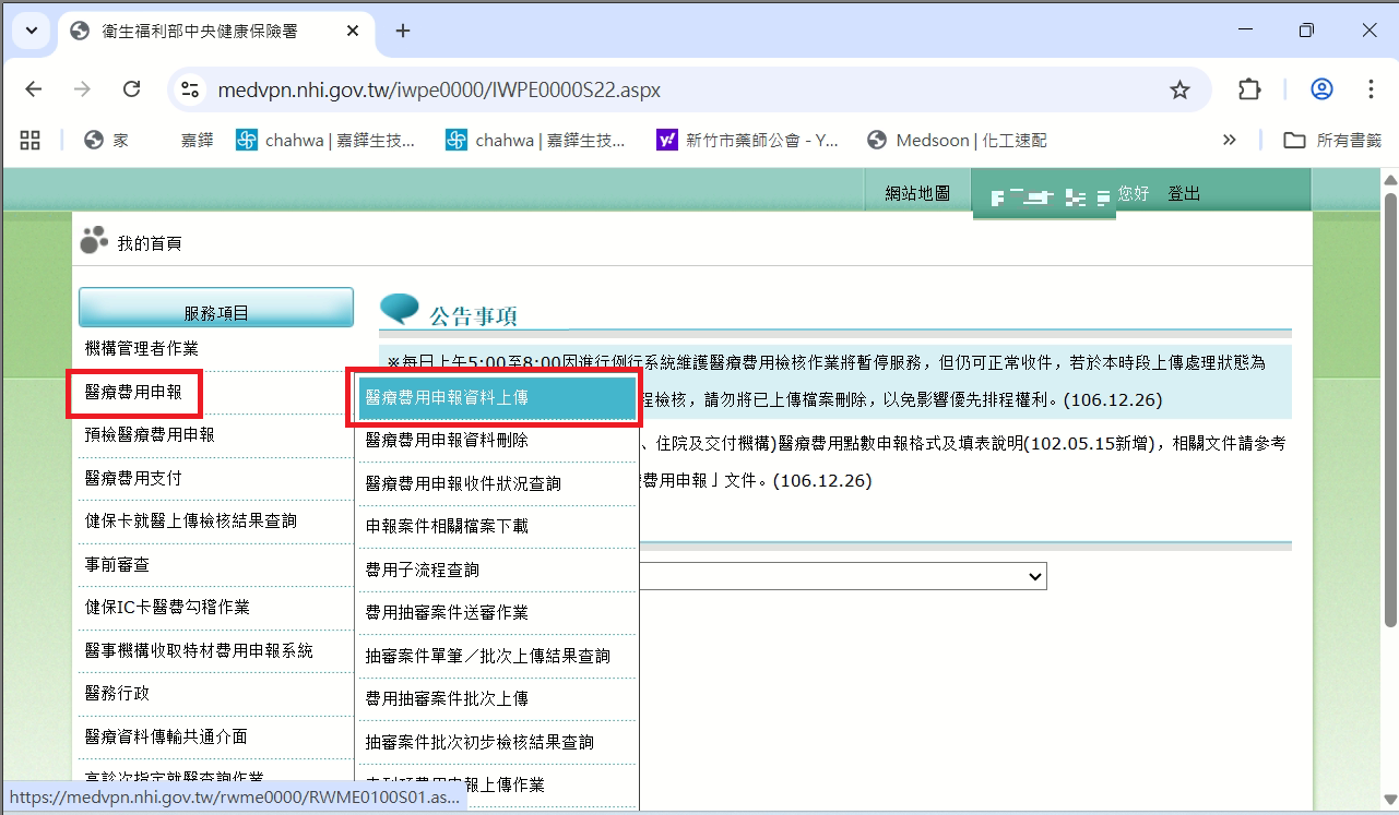 服務項目點選【醫療費用申報】>【醫療費用申報資料上傳】