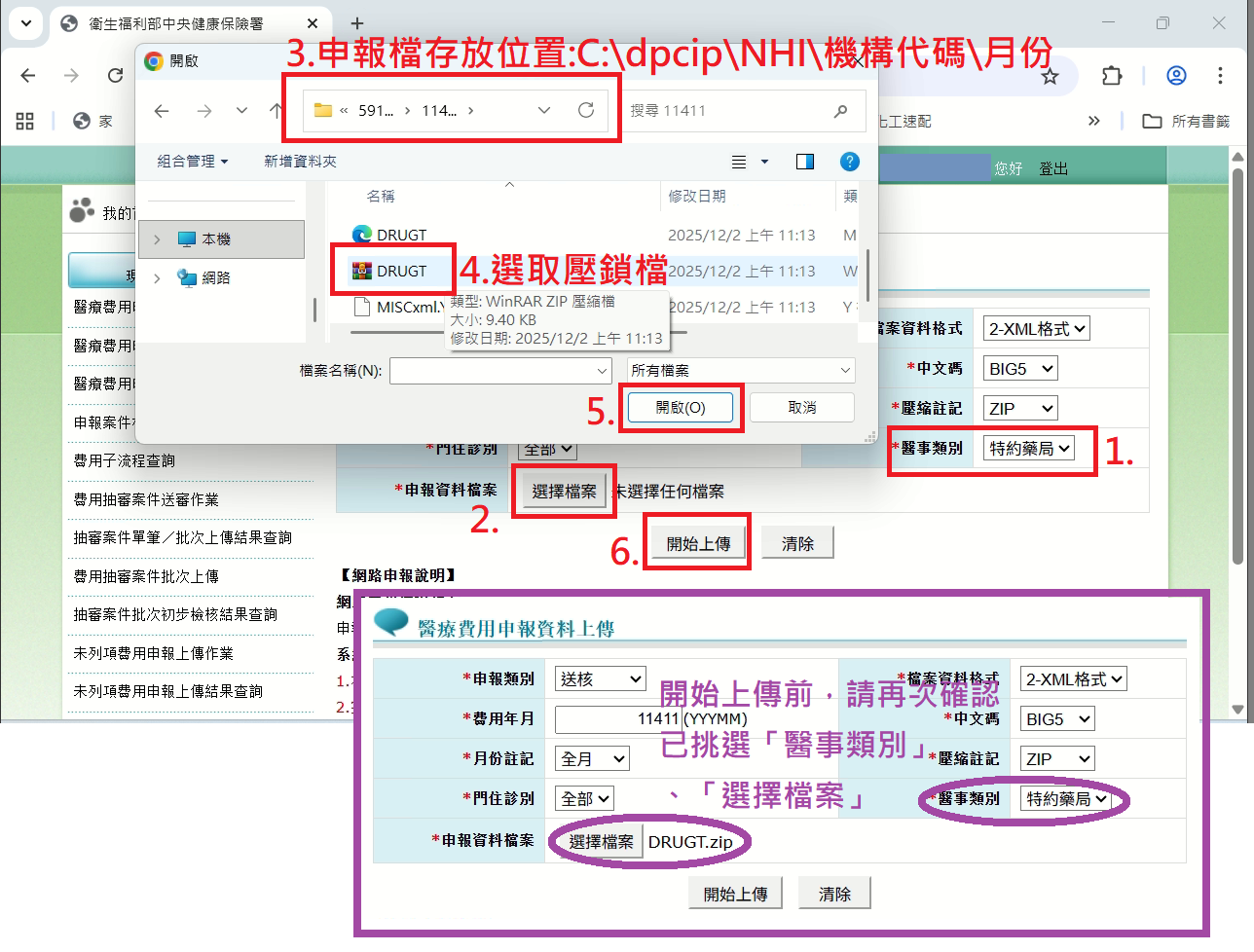 醫事類別選取【特約藥局】>【選擇檔案】>找到申報檔(壓縮檔)>【開啟】>【開始上傳】