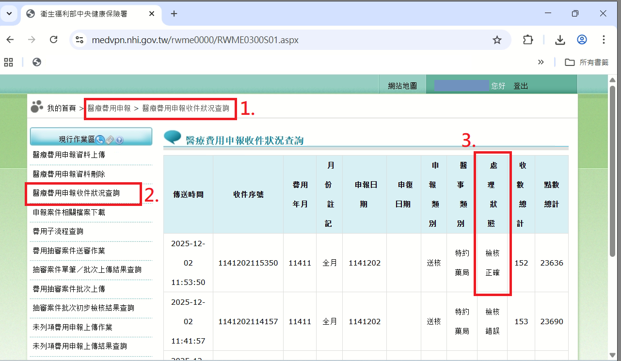 【醫療費用申報】>【醫療費用申報收件狀況查詢】>確認處理狀態