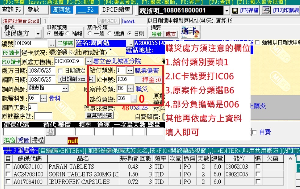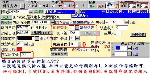 依照慢連箋鍵單完成後>最後再修正點選給付類別1-職業傷害、卡號IC06>上方案件分類修正點選連續>F5存檔